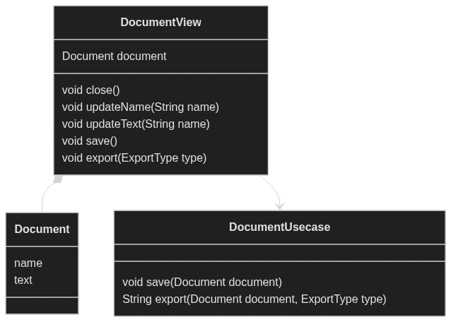この概念モデルでは、Documentという概念がユーザーから見える形でUI上に存在することを表現しています。 プロパティとしては、タイトルや本文があり、操作としては保存、タイトルや本文の編集、エクスポート、閉じるなどがあります。 ユーザーはこのDocumentという概念を操作することで、文章を作成・編集・保存することができます。